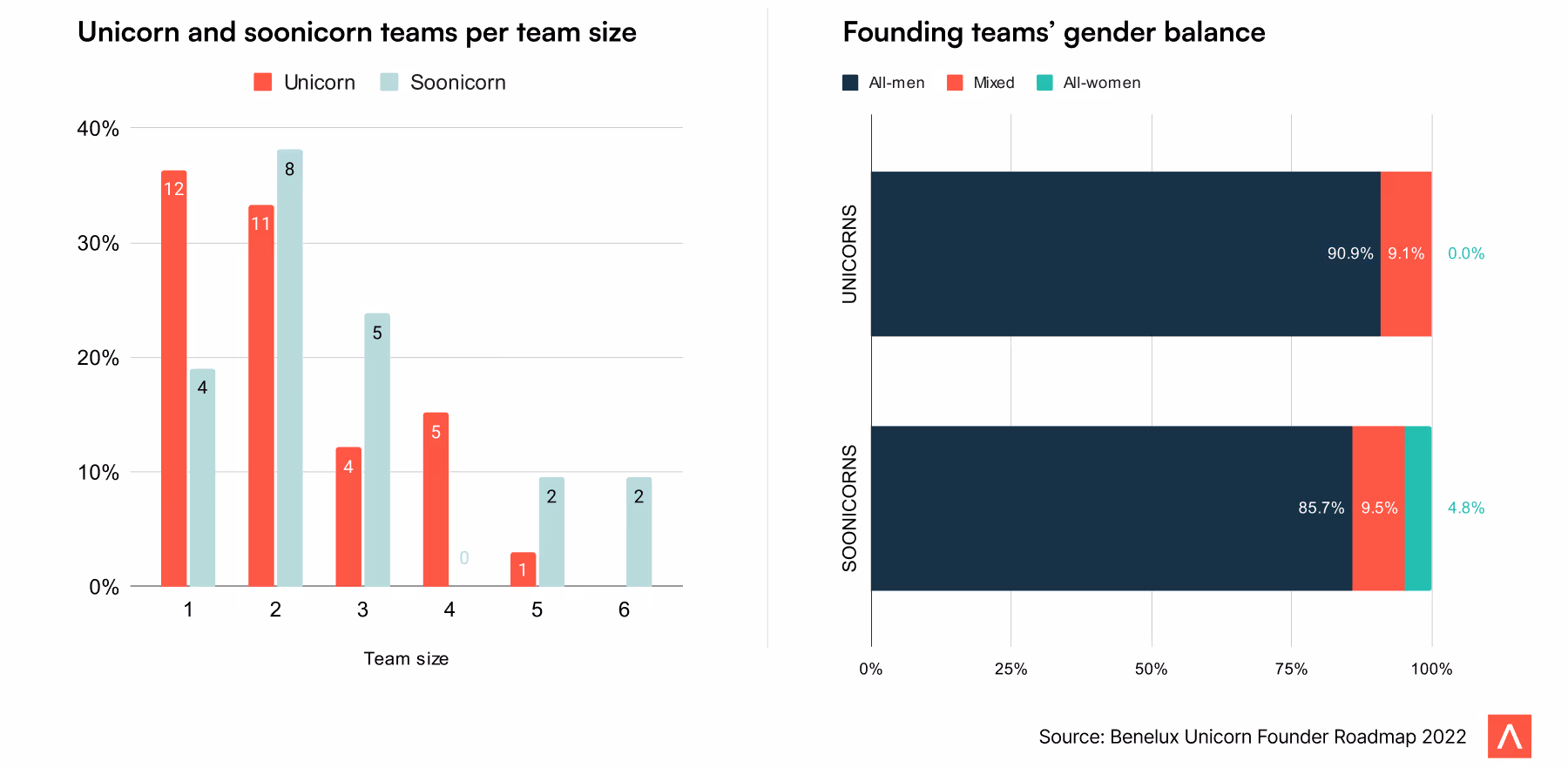 36% of Benelux unicorns are founded by a solo founder, making it the most common founding team size. However, the trend seems to be changing. Only four out of the 21 soonicorns from the Benelux region are founded by a solo founder.