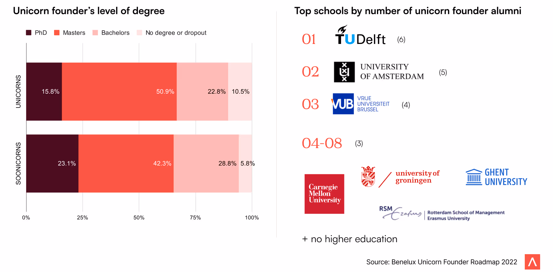 Founder’s background: Benelux unicorn founders are highly educated and different schools provide a more or less equal foundation to become unicorn founders.