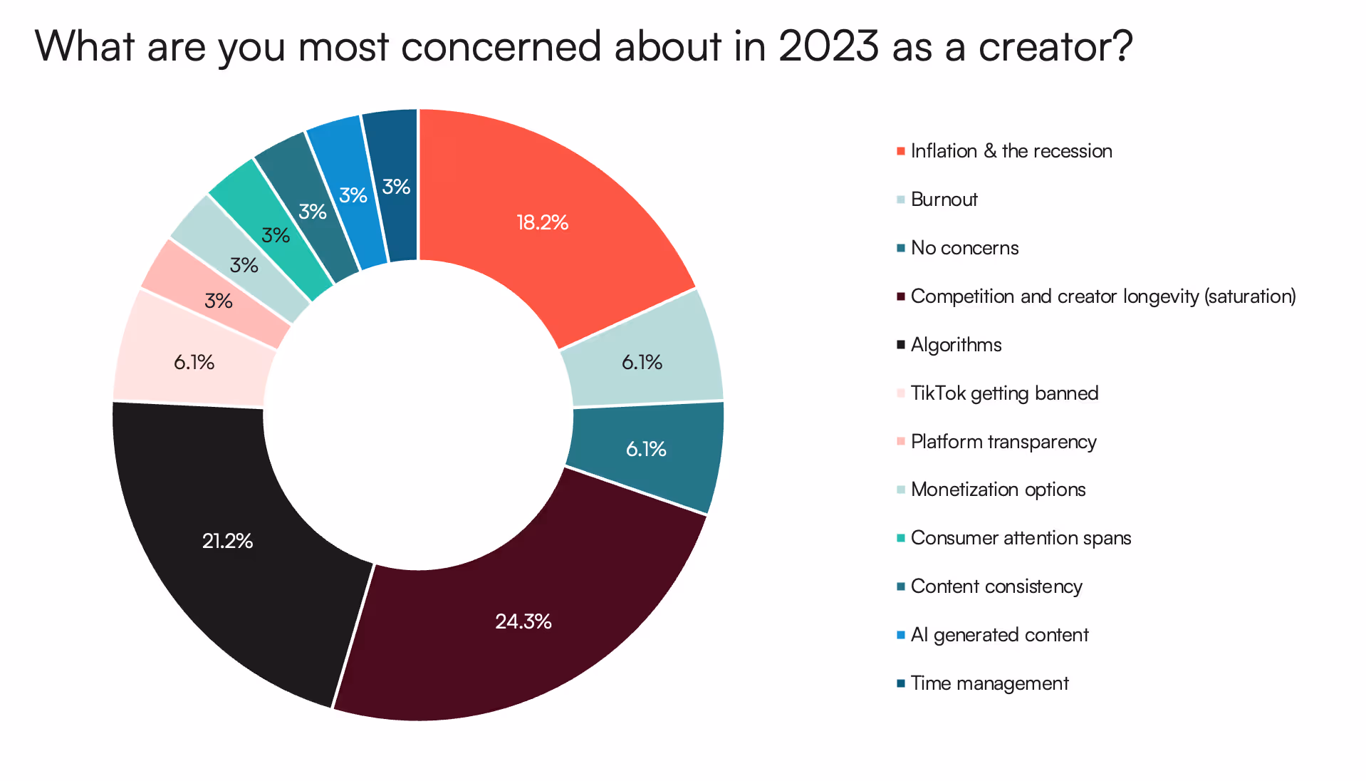 - Algorithms. Interestingly, our respondents did not cite inflation as their primary concern. They are more worried about the algorithms used by platforms that determine how creators reach their audience and make a living. The most frequently mentioned platform of concern among our respondents was TikTok, with some expressing fear of its potential ban.