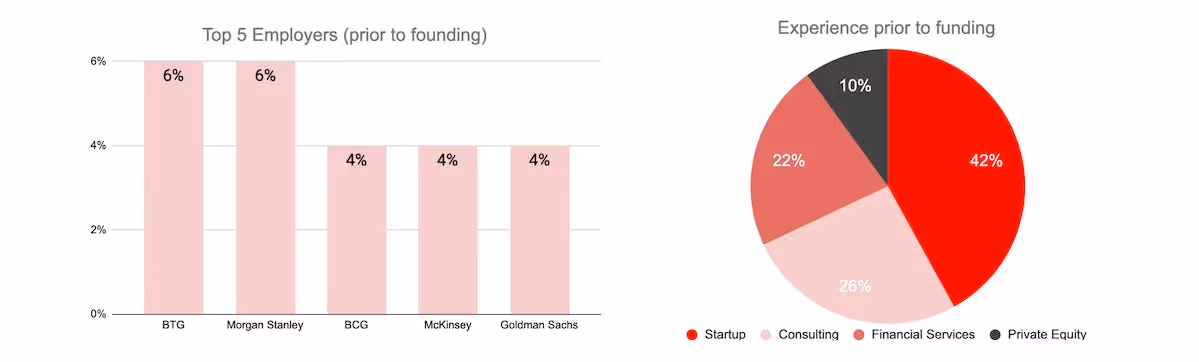 Previous employers have an important influence on the founding of the company. Around 60% of the founders analysed had experience working in top management consulting and financial services in McKinsey, BCG, Morgan Stanley, Goldman Sachs, BTG and Santander.