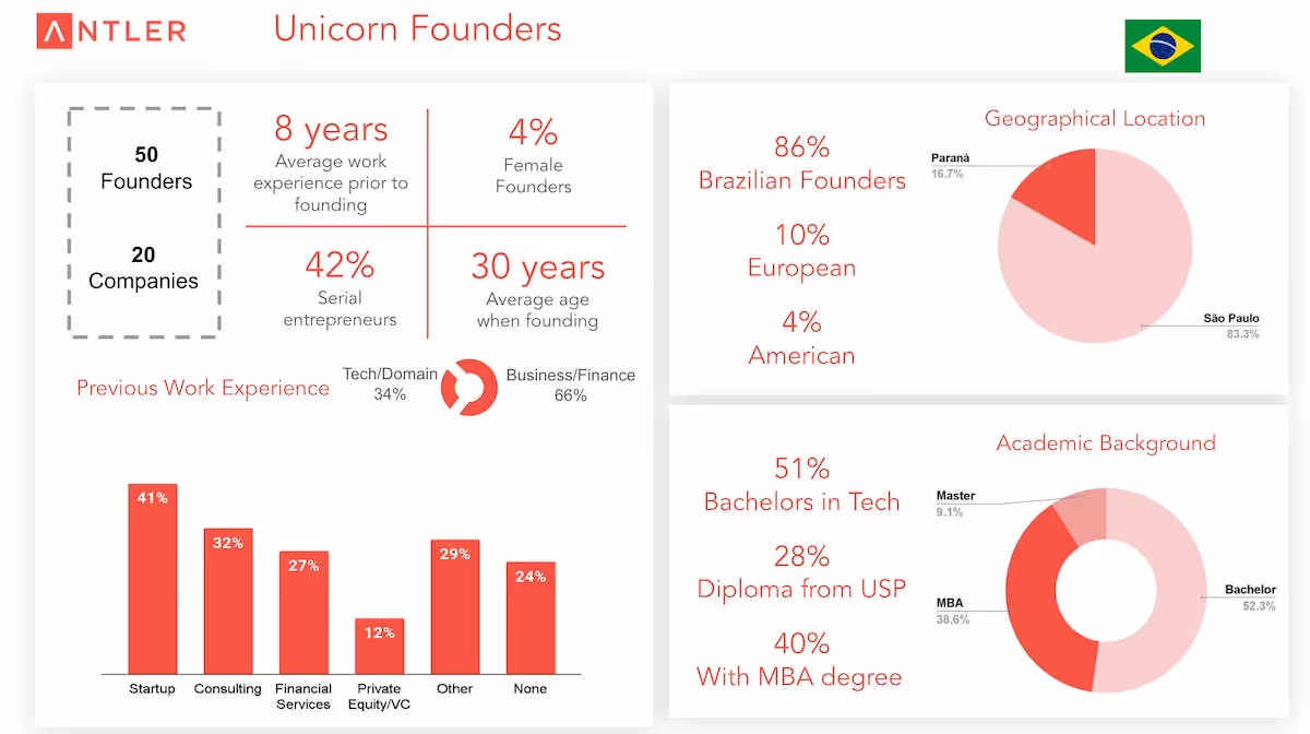 Even so, little attention has been given to its founders, especially, where they come from and their academic and professional backgrounds. Antler recently launched a series of articles mapping the origins and backgrounds of Unicorn founders in the DACH (Deutschland, Austria, and Switzerland) region and in Africa. With that in mind, we analysed the founders of billion-dollar companies in Brazil to uncover what they had in common before founding their businesses. Here's what we found.