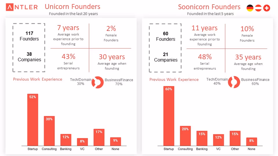 The majority of unicorn founders (52%) have previous startup experience, confirming the findings Antler's partner Alan Poensgen obtained in his article about Westwing. There he shared how working in a successful startup can have a positive flywheel effect on your own founder journey. Still, a relatively high share of unicorn founders come from traditional elitist networks, such as top management consulting (30%) and banking (12%).