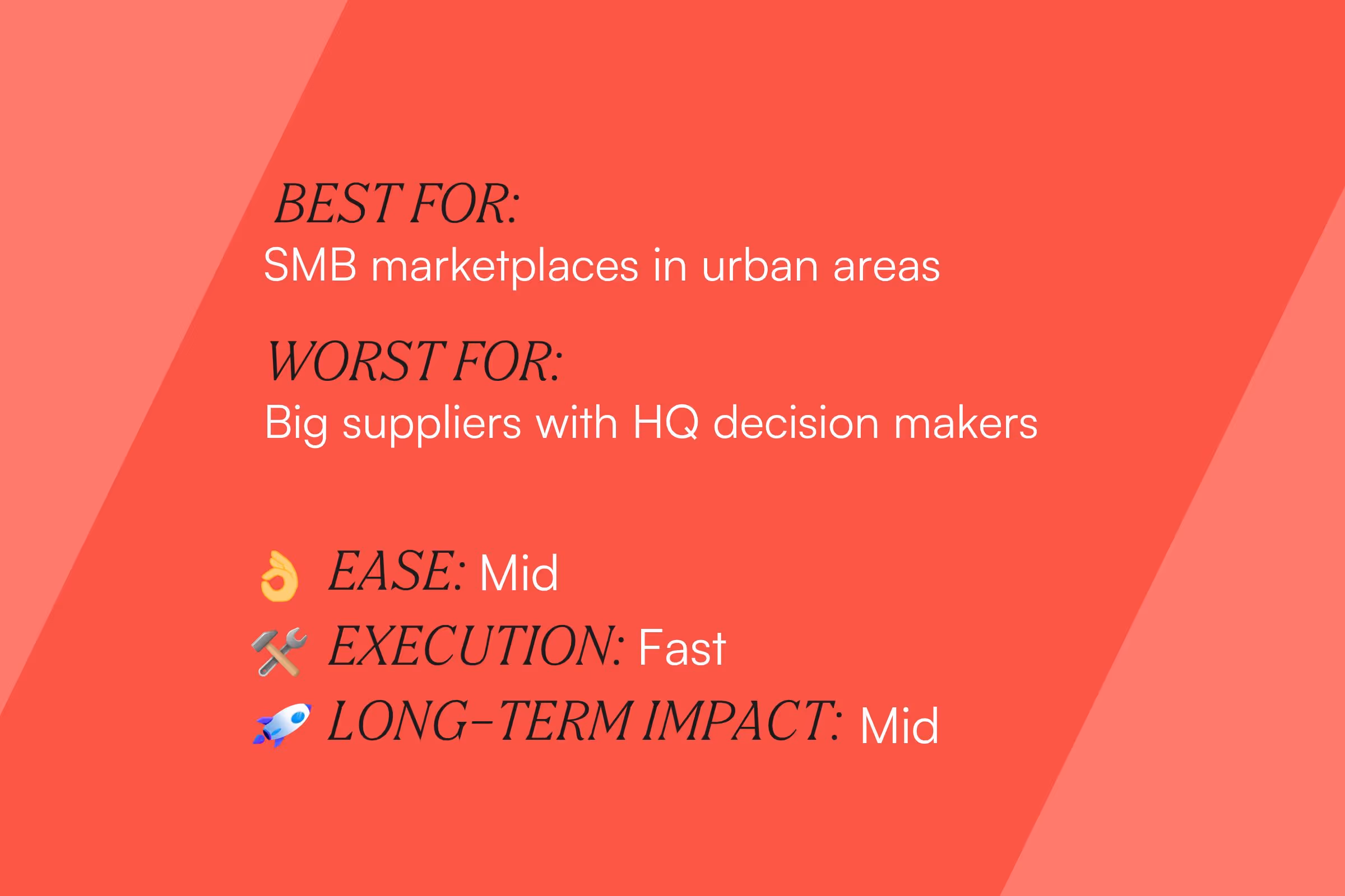 For many marketplace verticals, there are physical locations where the decision maker will be present (e.g. restaurants, taxi firms, warehouses, SMB retailers). Early Deliveroo employees used to go around London restaurants to sign up restaurants and at Airbnb we would visit vacation rental management companies unannounced and pitch supply. If your prospective suppliers are available to you in IRL, it’s a strong way to gain traction and get market validation for the solution.