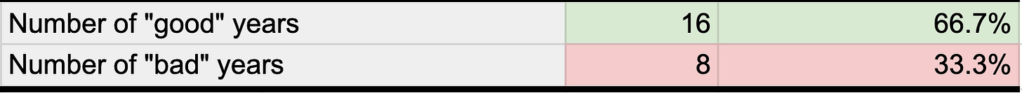 If we define a “good year” as one where US GDP growth is positive and the S&P 500 is up, then there are 16 good and 8 bad years between 1999 and 2022. There were 1242 tech unicorn IPOs during that period. Of those, 38 were born in “bad” years and 86 were born in “good” years.