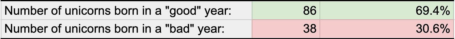 Notice: two thirds of the years are “good” and two thirds of the unicorns were born in “good” years. One third of the years were “bad” and one third of the unicorns were born in “bad” years. In other words, there is no statistical evidence that startups born in “bad” times are any less likely to reach unicorn status versus any other time.