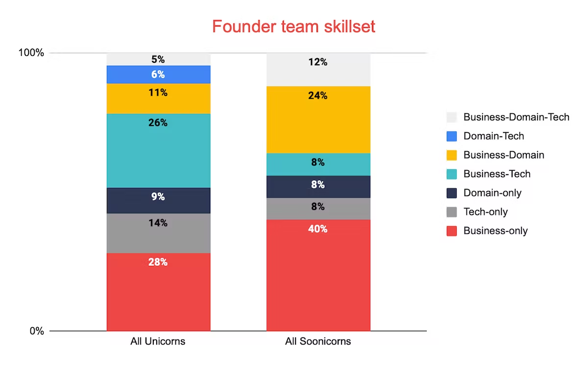 Looking at the skillsets of soonicorn teams, we found some interesting differences with unicorn team skills. For example, business-only teams comprise the largest group with 40%. There are also relatively more business-domain, domain-only, and teams with founders from all three backgrounds. This change is fueled by the overall increased presence of founders with domain backgrounds. Forty-four percent of teams have domain expertise within the industry they are founding in, meaning the team has at least one founder from the domain background. This finding is considerably higher than what we observed in the unicorn team, where only 31% of teams include domain experts.