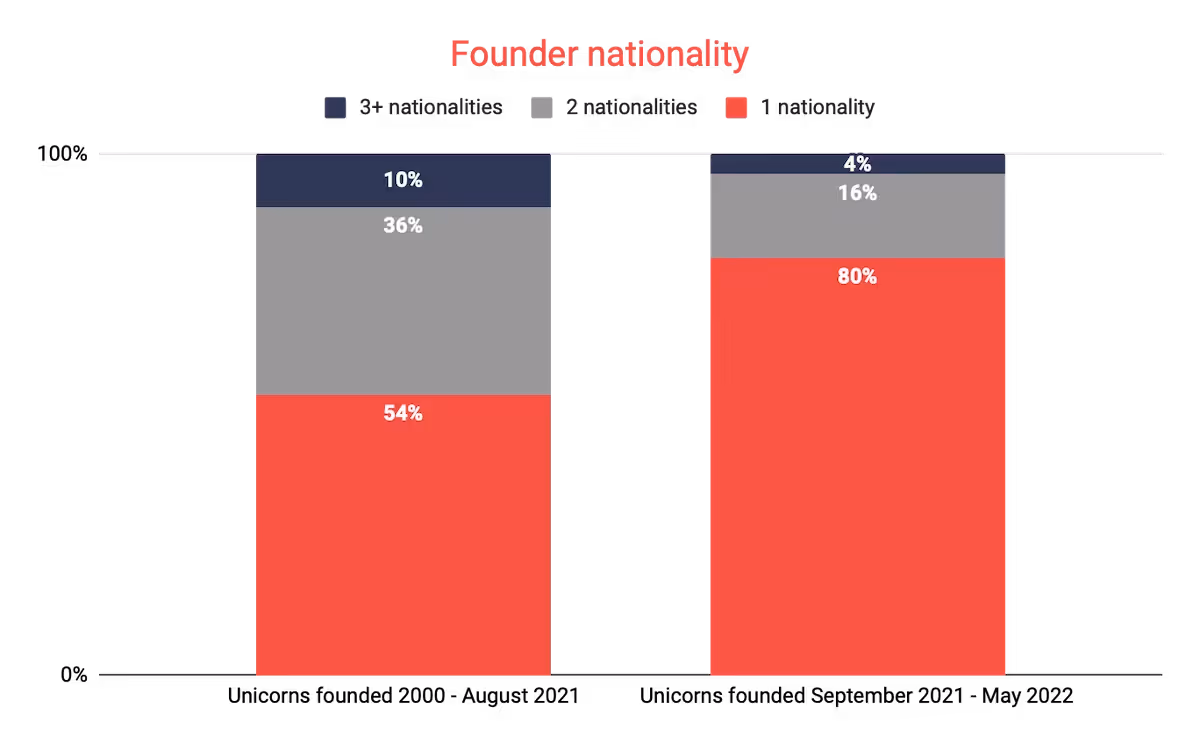 Looking into the individual founders’ skills and backgrounds, we discovered that the share of tech founders has substantially increased in the 2022 class. While previously techies comprised 26% of all founders, in the most recent unicorns 35% of founders had a technical background. This change also means the proportion of founders from a business background has decreased significantly. Of the startups covered in the 2021 report, 58% came from business experience, while in the 2022 class the proportion drops to 42% of all founders.