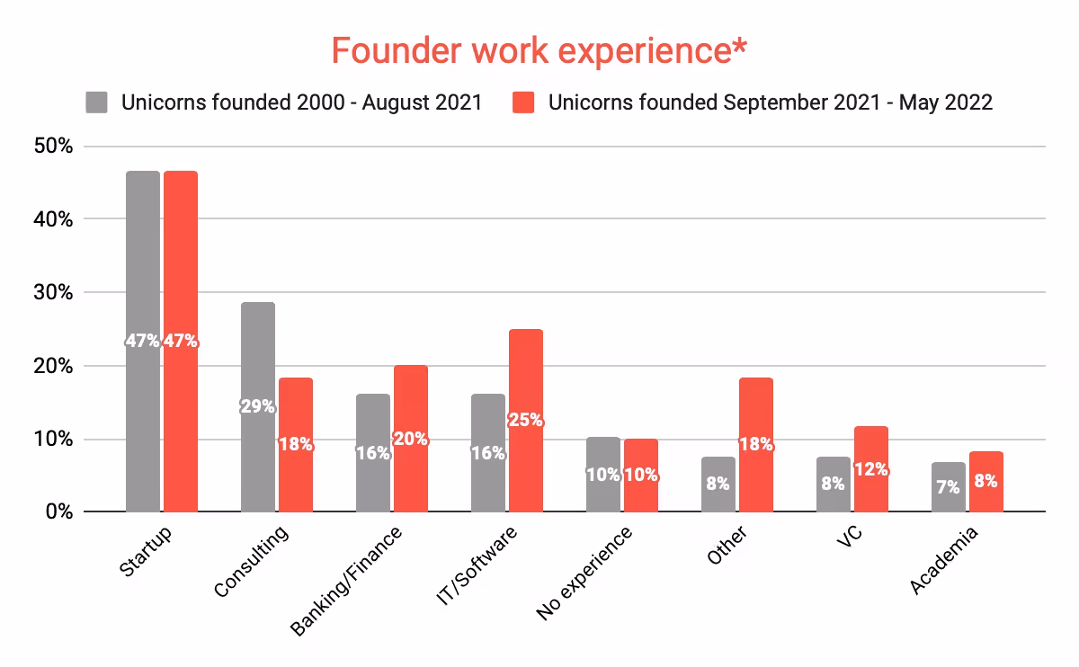We also saw that fewer class of 2022 unicorn founders worked in consulting than previously. In the 2022 unicorn class, 18% had gathered consulting experience in contrast to 29% of the unicorn founders before. While the tide appears to be turning, consulting remains a fruitful career path as 25% of all unicorn founders have had some experience in consulting.