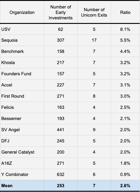 The point here is that margins are fine. A unicorn spotting rate of 1% portends failure whereas 2.5% promises exceptionality — at least in theory. What about in reality?
