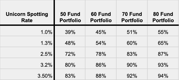 The math affirms intuition: to be a successful early stage investor, you need the ability to invest in above average startups. But just how good do you have to be? Well, if you want the portfolio to have an 80% probability of yielding at least one unicorn, the same math will show you need to be investing in startups with unicorn probabilities above 2.5%.