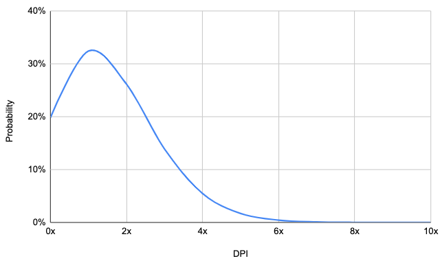 So consider now our baseline, a hypothetical VC that can achieve these survivorship rates. This VC is seeing 48% of the companies they seed graduating to additional funding. Each of those has a 2.8% of a unicorn exit. So every investment they make has a 1.3% unicorn probability. If they seed 80 companies over the lifetime of the fund their expected DPI is 1.6 with a DPI density that looks like this: