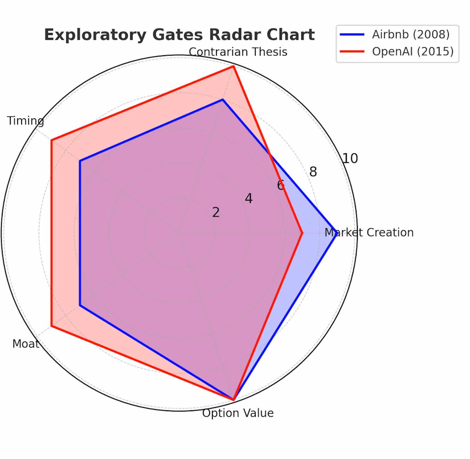 Example: OpenAI in 2015 would have “failed” Problem Core (no clear buyer, no TAM, no ROI). But on Exploratory Gates: