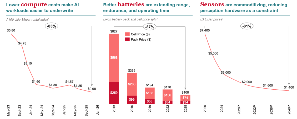 The cost curves across compute, batteries, and sensors are moving in the right direction simultaneously and rapidly. A100 chip rental costs have dropped 83% since mid-2023 (Silicon Data). Li-ion battery pack prices have fallen 87% since 2013 (BloombergNEF). L3 LiDAR prices have come down 81% from their peaks and are projected to continue declining through 2040 (Coatue Report). Each of these individually matters. Together, they are transforming the unit economics of deploying intelligent robots at scale.