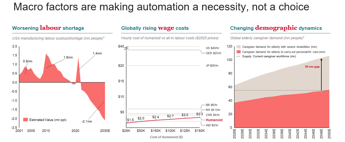 At the same time, when a humanoid robot costs anywhere around $25K to $100K to manufacture and the all-in hourly cost of a US warehouse worker is $40/hr, the economics of substitution become increasingly compelling at scale (Goldman Sachs Research).