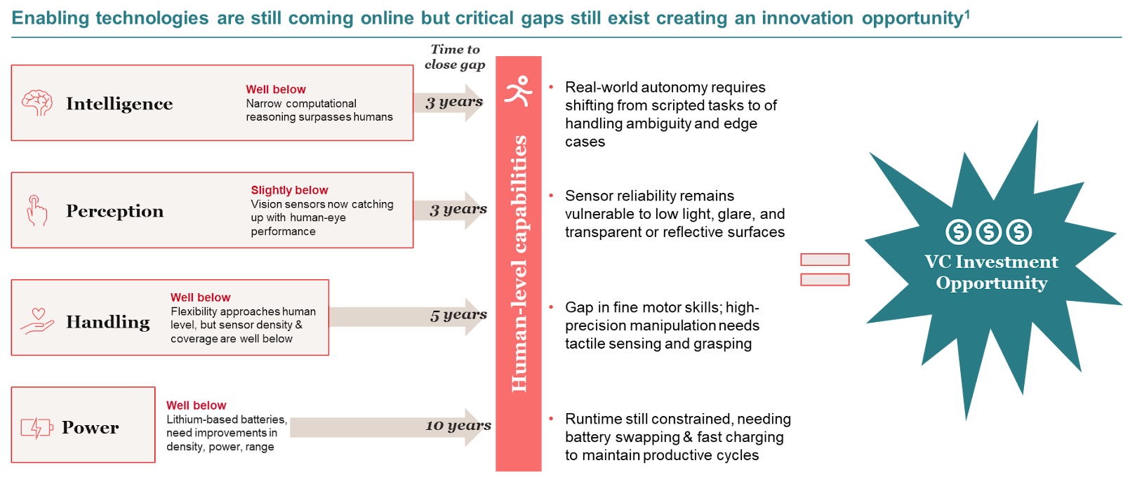 Real-world autonomy still struggles with ambiguity and edge cases. Sensor reliability degrades in challenging light conditions. Fine motor manipulation requiring dense tactile feedback is still roughly 5 years away from human equivalence. Battery runtime is a decade-scale problem. Throughput and offtake of robots in real-world environments are still 20-50% (Bain Report) of human levels.