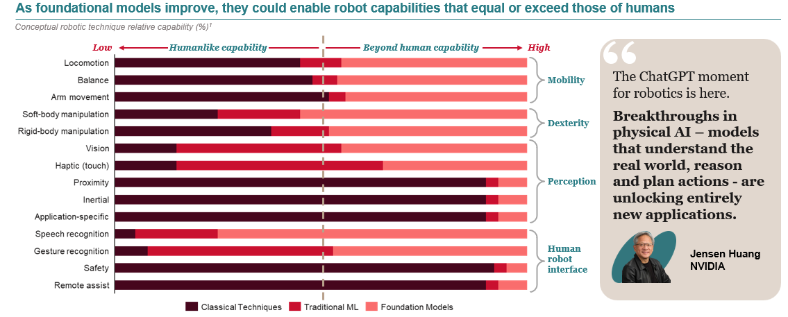 McKinsey data on conceptual robotic capabilities shows that foundation models are pushing mobility and perception toward or beyond human-level performance on key dimensions. Proximity sensing, inertial systems, and application-specific sensors are already well beyond human benchmarks. Locomotion and balance have reached human-equivalent ranges. The gaps that remain, particularly around fine motor dexterity and handling, are real but narrowing.