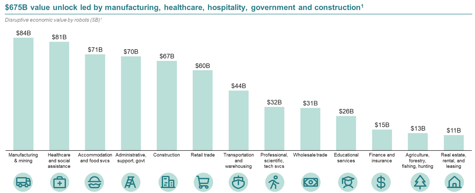 Robotics will unlock $675B of disruptive economic value across industries, with manufacturing and mining ($84B), healthcare and social assistance ($81B), accommodation and food services ($71B), administrative support and government ($70B), and construction ($67B) leading the way (McKinsey Report).