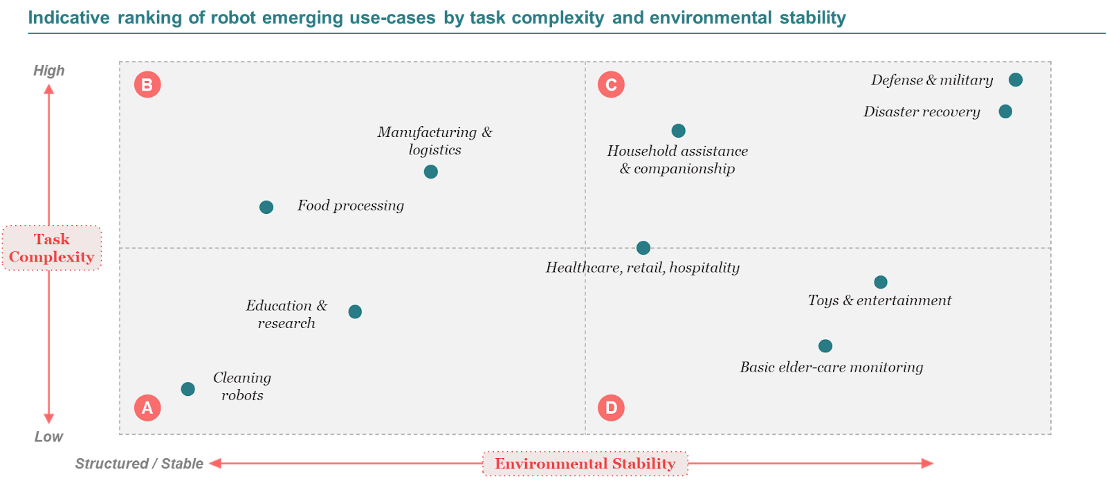 The lower-right, low complexity in dynamic environments, covers delivery bots, consumer service robots, entertainment. We can see interesting niches here, with moderate TAMs . Worth watching opportunistically but not where we are concentrating.