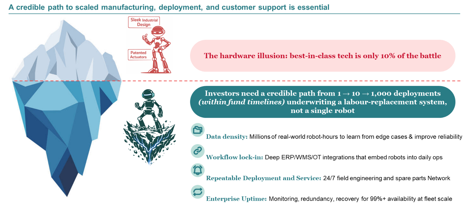Specifically: does the company have a credible path to accumulating millions of real-world robot-hours to learn from edge cases and improve reliability over time? Does it have the ERP, WMS, and operational technology integrations that embed the robot into daily workflows, creating genuine switching costs? Does it have the 24/7 field engineering and spare parts infrastructure to deliver 99-plus percent uptime at fleet scale? And critically, does it have a repeatable deployment playbook that allows it to go from 1 to 10 to 1,000 sites without the economics deteriorating?