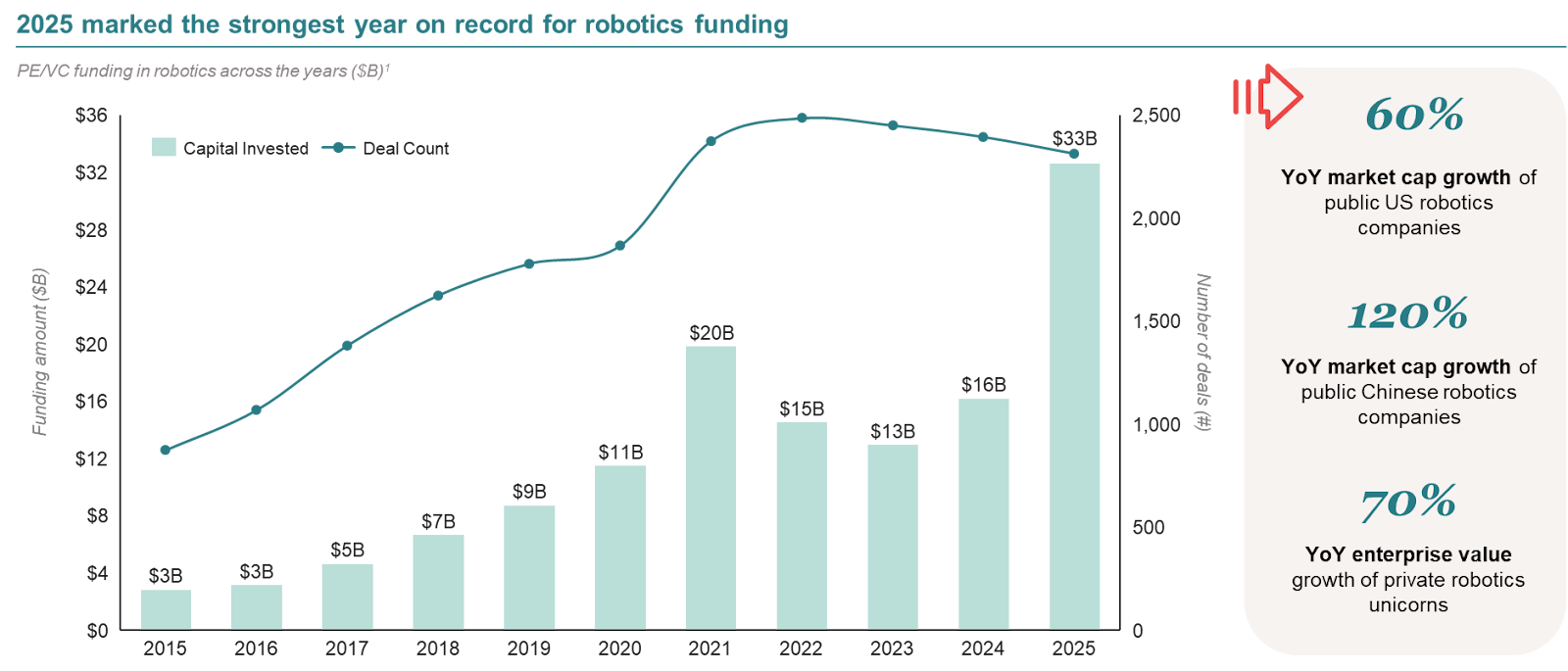 2025 was the strongest year on record for robotics funding, with PE/VC investment reaching $33B (Pitchbook). Public US robotics companies saw 60% YoY market cap growth. Public Chinese robotics companies saw 120% YoY market cap growth (F-Prime Report). Private robotics unicorns saw 70% enterprise value growth year over year.