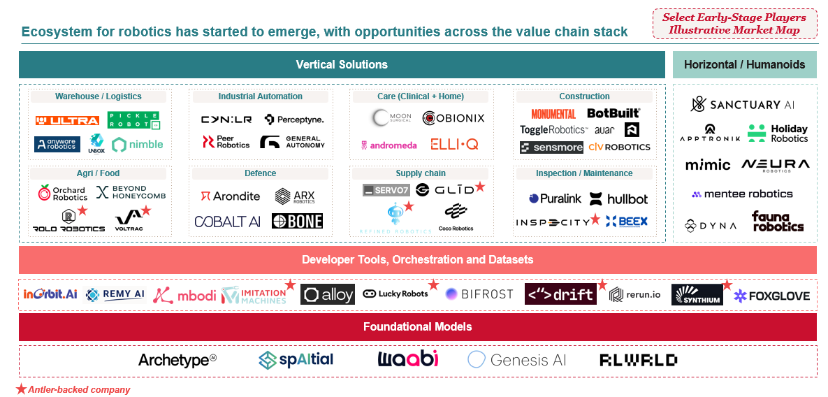 We have also become more interested in the build approach at the application layer. There is a meaningful difference between companies assembling a robot from third-party components and those taking a more integrated, full-stack approach (like Holiday Robotics). Full-stack is harder to execute, but when it works it creates tighter feedback loops between hardware, software, and real-world deployment data that compound over time. Antler’s global portfolio reflects this breadth: we have backed 20+ robotics and Physical AI companies at the early stage, across the stack, from developer tools and simulation through vertical applications in logistics, agritech, inspection, and industrial automation, to more horizontal platforms. The market map below captures where some early-stage companies are playing across the stack today.